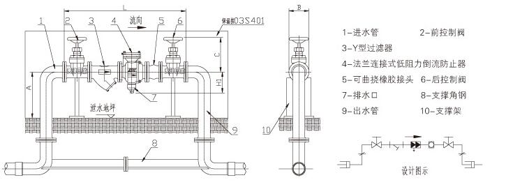 (5) 倒流防止器前(后) 建議設(shè)置伸縮節(jié)或可曲撓橡膠接頭,以便拆卸倒流防止器。